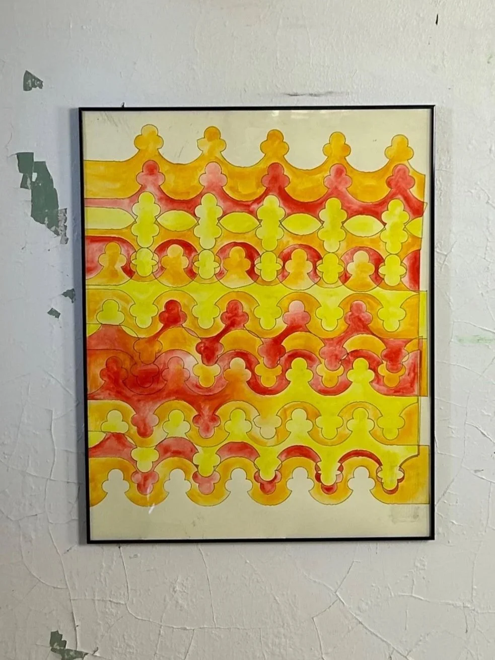 Ink Tracings of Burger King crown, sharpie, water color, handmade paper, glass panel and frame
